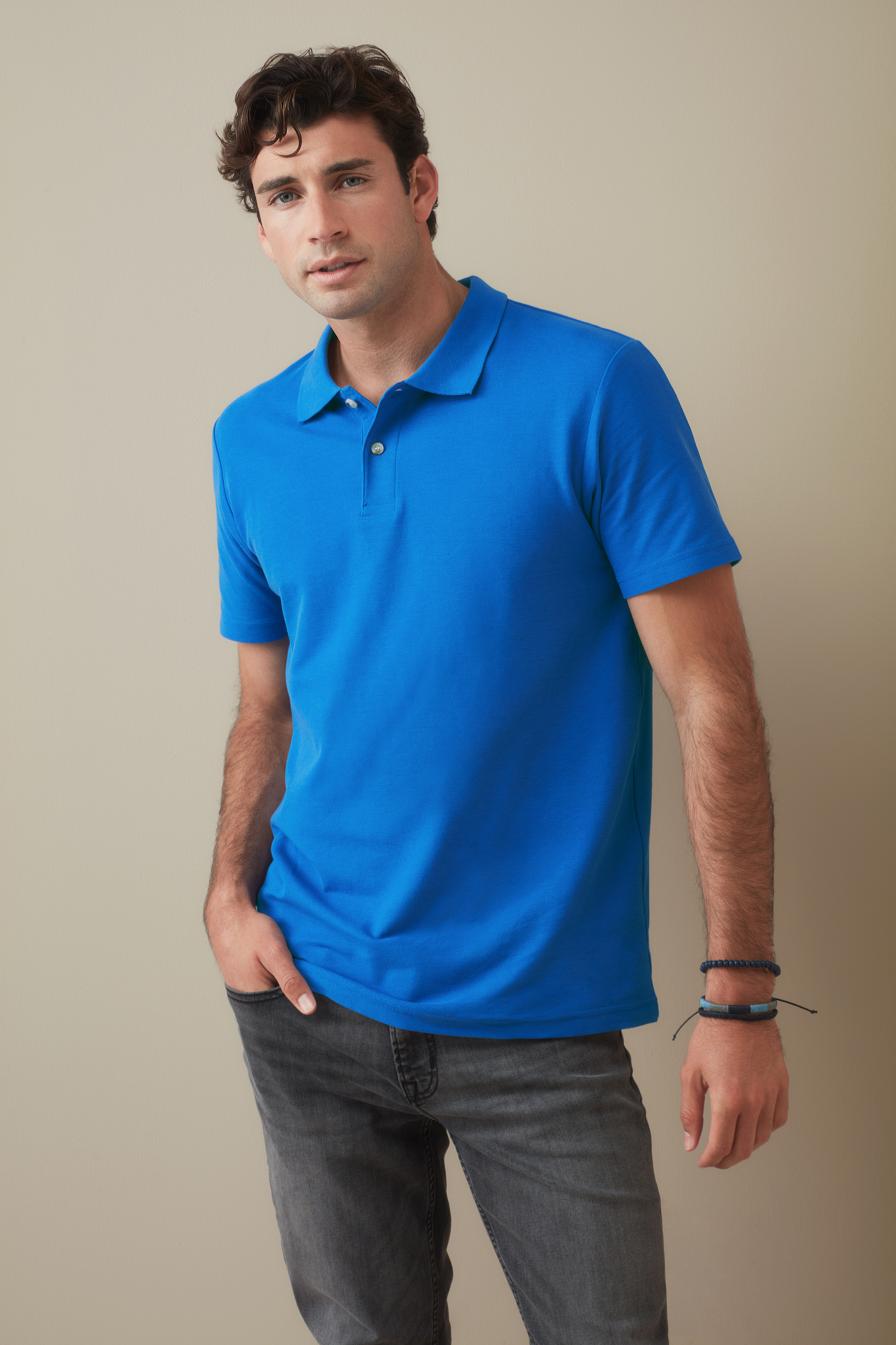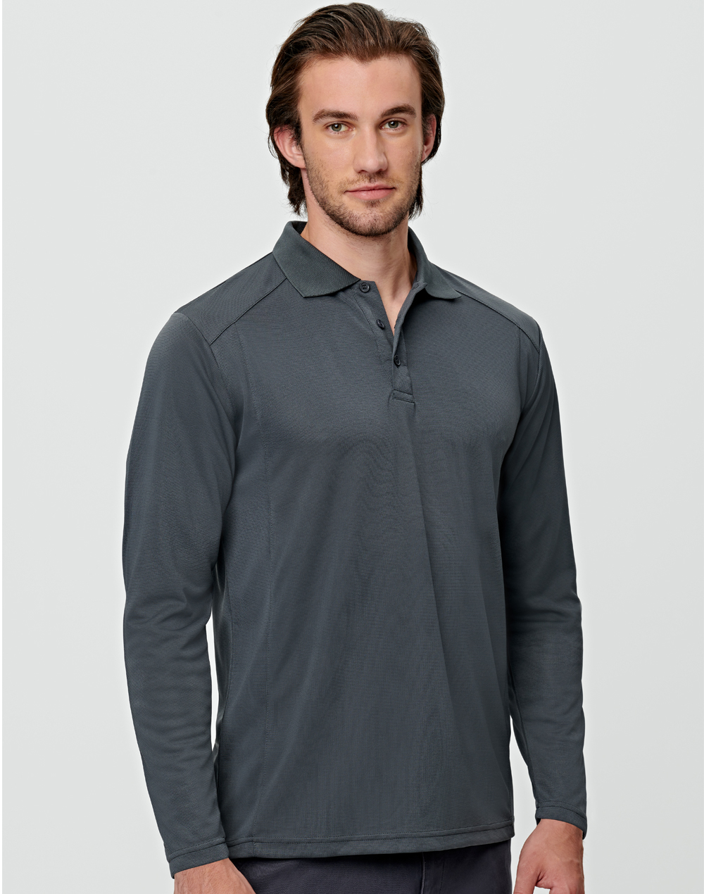 Short sleeve ribbed collared polo shirt, 3 button placket, tonal corozo buttons, Side seamed, double needle hems, preshrunk to minimise shrinkage, moisture wicking, quick drying